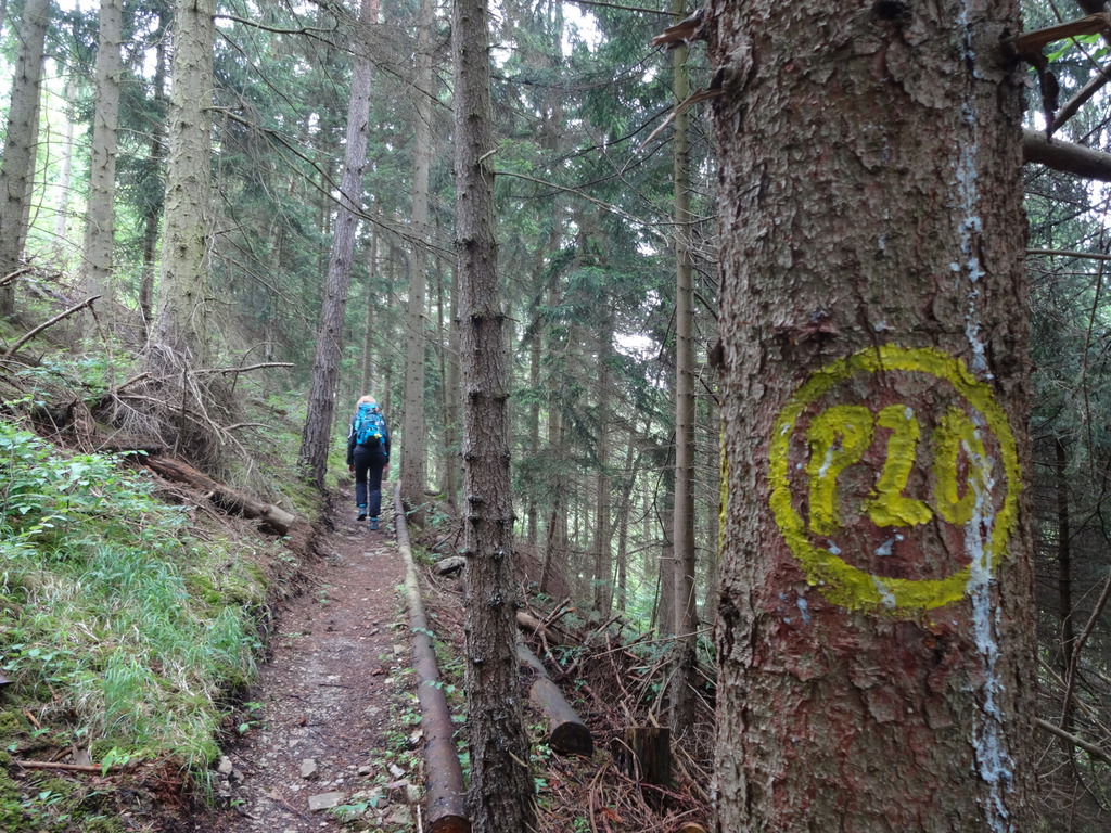 kurze Abstecher lohnt sich wegen der Aussicht. Ein breiter Weg läuft nun abwärts und durch Weinberge zum Bachhof. Von dort führt ein Serpentinenweg durch Wald und Wiesen hinauf zu einer Schutzhütte.