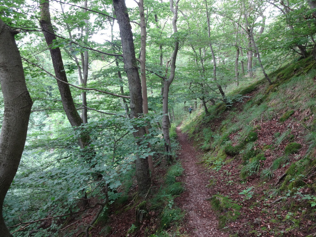 In Serpentinen geht es nun hinab ins Tal und drüben erneut aufwärts nach Dattenberg zum Sportplatz. Nachdem der Ort durchquert wurde, führt ein steiler Wiesenweg bergab. Einige Meter oberhalb des