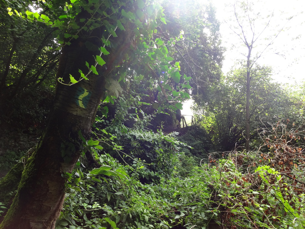 schließlich am Waldrand entlang über die Höhe und dann durch Buchenwald hinab ins Hammersteiner Bachtal. Jetzt führt der Rheinsteig durch die Häuser von Nieder-Hammerstein und dann mitten durch einen